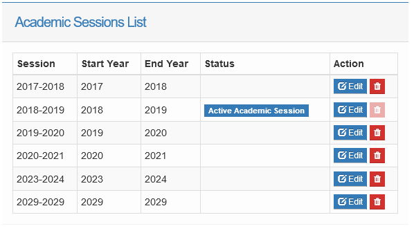 In the settings menu, you can define and manage your academic sessions by clicking the Academic Sessions tab as shown in the image above.