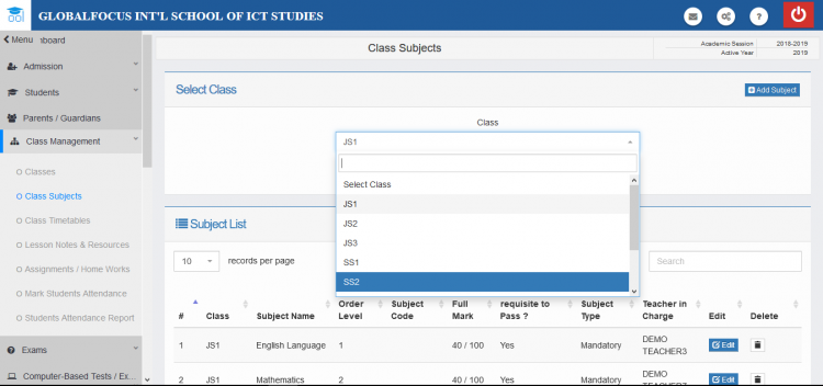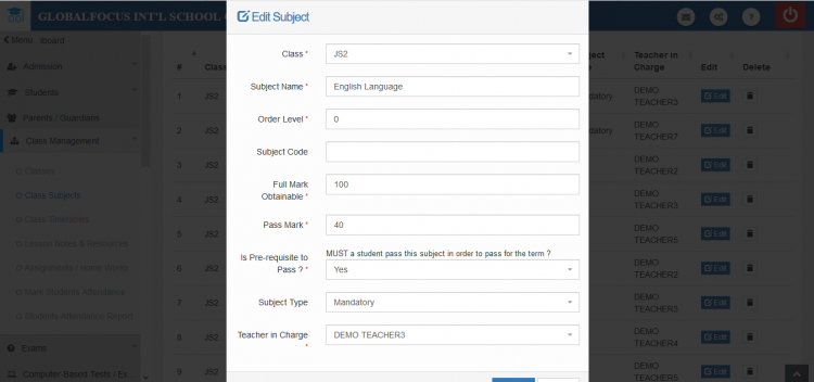5. Scroll down to Teacher in charge field and select the teacher you want to be in charge of the subject.