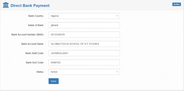 You can configure payment gateways for accepting payments. The system ships with Remita and Paystack gateways for electronic payments and an option for manual bank payment. Support for other payment processors is being developed.