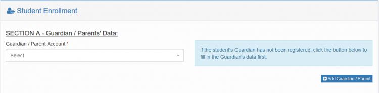 Here you specify the student's parent information. If the parent information already exists, select it from the drop-down menu. If the information has never been saved before, you should create another one by clicking the Add Guardian/Parent button by the left.