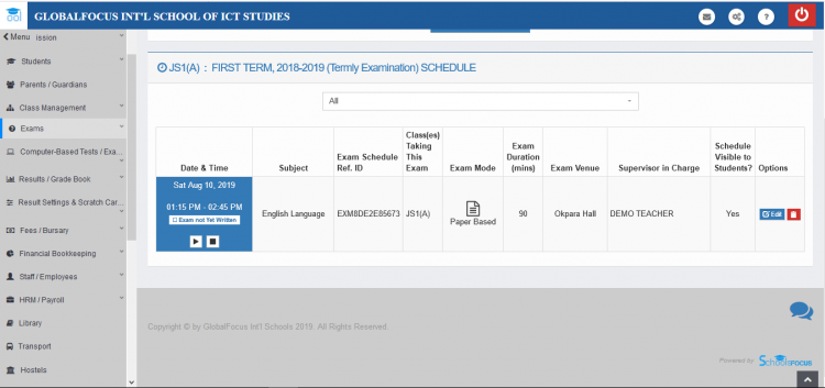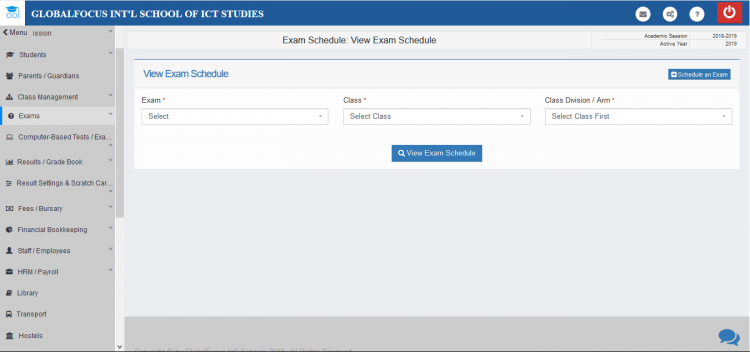 Exam timetables are viewed per class.To view prevoiusly created exam schedules for any class,