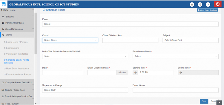Exam shedules allow you to generate an exam timetable for the different subjects offered in the school for the current term. To create and manage exam schedules, the exam schedules functonality is found under the Exams menu in the dashboard.