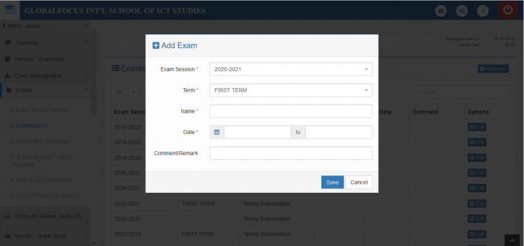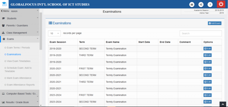 Examinations here refers to the exams written at the end of terms. By default, every term created in the system has an exam assigned to it. In most cases, there is no other action required.