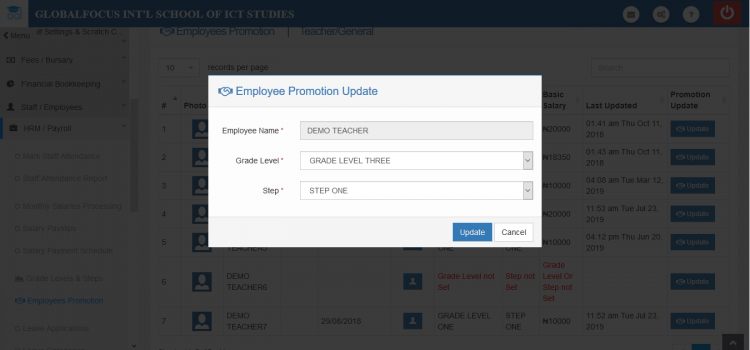 6. Click Update to save the promotion.The employee is now promted to the new levels